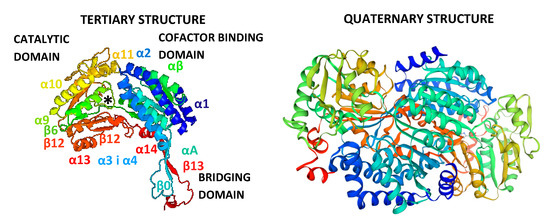 The first tertiary structures of class 2 and 3 ALDH were published in 1996–1997 [20,21] and as of today crystal structures of several human ALDH are described in literature, e.g., ALDH1A1 [22], ALDH1A3 [23], ALDH2 [24], ALDH3A1 [24], 3A2 [25], ALDH4A1 [26]. Among ALDHs both, dimers and tetramers can be found. The predicted tertiary structure for human long ALDH3B2 isoform was compared with rat ALDH3A1. Similar structures were observed including the three major domains: the catalytic domain, the NAD binding domain and an oligomerization domain, involved in the dimer formation (Figure 10). The two first mentioned domains are separated by the active site cleft [1]. The quaternary structure shows the homo-dimer. The Global Model Quality Estimation (GMQE) is 0.77 indicating high reliability. The value of QMEAN Z-score (−0.01) indicates good agreement between the model structure and experimental structures of similar size.