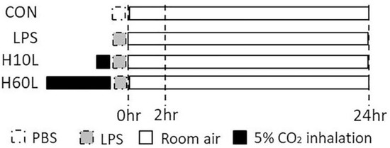 Schematic diagram of the first part of experimental protocol. The experiment was divided into two parts. The first part of the experiment included following 4 groups at 2 and 24 h (n = 6 in each group) after phosphate-buffered saline (PBS) or lipopolysaccharide (LPS) spray. Control (CON) group (Group 1): Intratracheal PBS (50 μL) was sprayed into the lungs of the mice in the CON group. LPS group (Group 2): Same concentration of LPS (2 mg/kg) was sprayed into the lungs of the mice in the various experimental groups. Two of the LPS groups also received carbon dioxide by exposure to 5% carbon dioxide for 10 min (Group 3: H10L group) or 60 min (Group 4: H60L group) before the LPS spray.