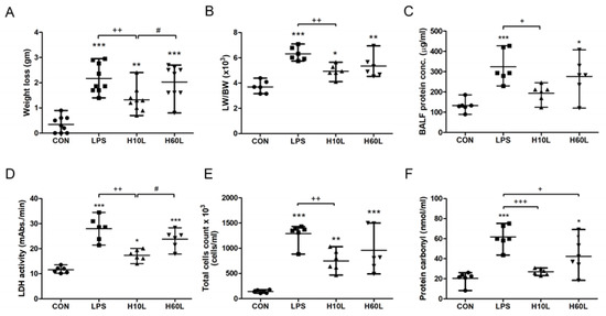 The effects of pre-treatment with inhaled carbon dioxide on lipopolysaccharide (LPS)-induced weight loss, pulmonary edema, inflammatory lung injury, inflammatory cell infiltration, and oxidative stress. C57BL/6 mice were challenged with LPS (2 mg/kg intratracheally) with or without pre-treatment with inhaled carbon dioxide for 10 min (H10L) or 60 min (H60L) before LPS administration. Control (CON) animals were treated with PBS solution. (A) Body weight loss was recorded 24 h after LPS administration (n = 9 per group). (B) The lung weight to body weight ratio (LW/BW) was recorded 24 h after treatment. Total protein concentration (C) and lactate dehydrogenase (LDH) activity (D) were measured in bronchoalveolar lavage fluid (BALF) collected 24 h after treatment. (E) Total cell count was determined in BALF. (F) The concentration of protein carbonyl in serum 24 h after LPS administration was measured by ELISA. The data are expressed as the mean ± standard deviation (SD) (n = 6 per group). * Significantly different from the CON group (* p < 0.05, ** p < 0.01, *** p < 0.001). + Significantly different from the LPS group (+ p < 0.05, ++ p < 0.01, +++ p < 0.001). # Significantly different from the H10L group (# p < 0.05).