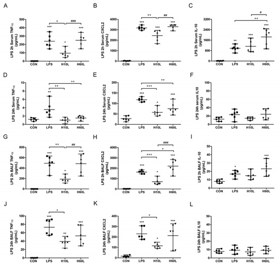 The effects of pre-treatment with inhaled carbon dioxide on lipopolysaccharide (LPS)-induced changes in TNF-α, CXCL2, and IL-10 concentrations. C57BL/6 mice were challenged with LPS (2 mg/kg intratracheally) with or without pre-treatment with inhaled carbon dioxide for 10 min (H10L) or 60 min (H60L) before LPS administration. Control (CON) animals were treated with PBS solution. The concentrations of TNF-α (A), CXCL2 (B), and IL-10 (C) in the serum at 2 h; TNF-α (D), CXCL2 (E), and IL-10 (F) in the serum at 24 h; TNF-α (G), CXCL2 (H), and IL-10 (I) in the bronchoalveolar lavage fluid (BALF) at 2 h; and TNF-α (J), CXCL2 (K), and IL-10 (L) in the BALF at 24 h after LPS administration were measured by enzyme-linked immunosorbent assay (ELISA). The data are expressed as the mean ± SD (n = 6 per group). * Significantly different from the CON group (* p < 0.05, ** p < 0.01, *** p < 0.001). + Significantly different from the LPS group (+ p < 0.05, ++ p < 0.01, +++ p < 0.001). # Significantly different from the H10L group (# p < 0.05, ## p < 0.01, ### p < 0.001).