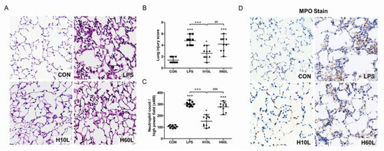 The effects of pre-treatment with inhaled carbon dioxide on lipopolysaccharide (LPS)-induced lung injury and inflammatory cell infiltration at 24 h. C57BL/6 mice were challenged with LPS (2 mg/kg intratracheally) with or without pre-treatment with inhaled carbon dioxide for 10 min (H10L) or 60 min (H60L) before LPS administration. Control (CON) animals were treated with PBS solution. (A) Representative images of hematoxylin and eosin-stained lung sections from one of the six mice per experimental group are presented. Original magnification = 40×. (B) The lung injury score and (C) neutrophil count were obtained from the images. The data are expressed as the mean ± SD. * p < 0.05, *** p < 0.001, compared with the CON group; +++ p < 0.001, compared with the LPS group; ## p < 0.01, ### p < 0.001, compared with the H10L group. (D) Representative images of myeloperoxidase (MPO)-stained lung sections from one of the six mice per experimental group are presented. Original magnification = 40×.