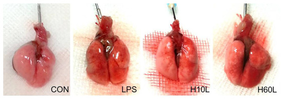 Gross lung pathology to demonstrate the effects of pre-treatment with inhaled carbon dioxide on lipopolysaccharide (LPS)-induced lung injury. C57BL/6 mice were challenged with LPS (2 mg/kg intratracheally) with or without pre-treatment with inhaled carbon dioxide for 10 min (H10L) or 60 min (H60L) before LPS administration. Control (CON) animals were treated with PBS solution. Representative images from one of the six mice per experimental group are presented.