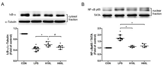 The effects of pre-treatment with inhaled carbon dioxide on lipopolysaccharide (LPS)-induced NF-κB activation. C57BL/6 mice were challenged with LPS (2 mg/kg intratracheally) with or without pre-treatment with inhaled carbon dioxide for 10 min (H10L) or 60 min (H60L) before LPS administration. Control (CON) animals were treated with PBS solution. The cytosolic levels of IκBα (A) and nuclear levels of NF-κB p65 (B) in lung tissues 2 h after LPS administration were analyzed by Western blot analysis and are expressed as fold change relative to α-tubulin and TATA, respectively. The data are expressed as the mean ± SD. * Significantly different from the CON group (p < 0.05). + Significantly different from the LPS group (p < 0.05). # Significantly different from the H10L group (p < 0.05).