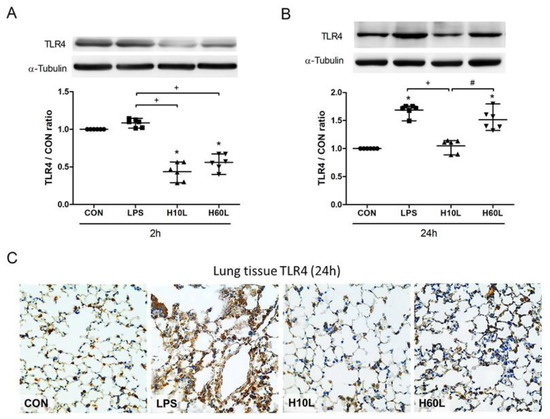 The effects of pre-treatment with inhaled carbon dioxide on lipopolysaccharide (LPS)-induced toll-like receptor 4 (TLR4) expression. C57BL/6 mice were challenged with LPS (2 mg/kg intratracheally) with or without pre-treatment with inhaled carbon dioxide for 10 min (H10L) or 60 min (H60L) before LPS administration. Control (CON) animals were treated with PBS solution. The surface expression of TLR4 was analyzed from the membrane fractions of lung tissues at 2 h (A) and 24 h (B) after LPS by Western blot analysis and is expressed as fold change relative to α-tubulin. The data are expressed as the mean ± SD. * Significantly different from the CON group (p < 0.05). + Significantly different from the LPS group (p < 0.05). # Significantly different from the H10L group (p < 0.05). (C) Representative images of TLR4-stained lung sections from one of the six mice per experimental group are presented. Original magnification = 40×.