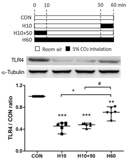 Schematic diagram of the second part of experimental protocol and the effects of carbon dioxide inhalation on toll-like receptor 4 (TLR4) expression. To investigate the effect of inhaled carbon dioxide on TLR4 expression in the lungs, the second part of experiment included following 4 groups at 1 h (n = 6 in each group). Control (CON) group (Group 1): C57BL/6 mice were treated with room air for 60 min. H10 group (Group 2): Mice were treated with room air for 50 min followed by inhaled carbon dioxide for 10 min. H10+50 group (Group 3): Mice were treated with inhaled carbon dioxide for 10 min followed by room air for 50 min. H60 group (Group 4): Mice were treated with inhaled carbon dioxide for 60 min. The surface expression of TLR4 was analyzed in the membrane fractions of lung tissues at the indicated time points by Western blot analysis and is expressed as fold change relative to α-tubulin. The data are expressed as the mean ± SD. * Significantly different from the CON group (** p < 0.01, *** p < 0.001). + Significantly different from the H10 group (p < 0.05). # Significantly different from the H10+50 group (p < 0.05).