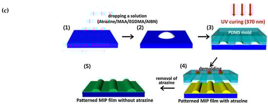 Schematic representations of protocols used in surface imprinting; (a) imprinting immobilized template on silica surfaces, reproduced from [35] with permission; (b) imprinting by surface grafting, reproduced from [36] with permission; and (c) soft lithography and UV initiated polymerization, adapted from [37] with permission.