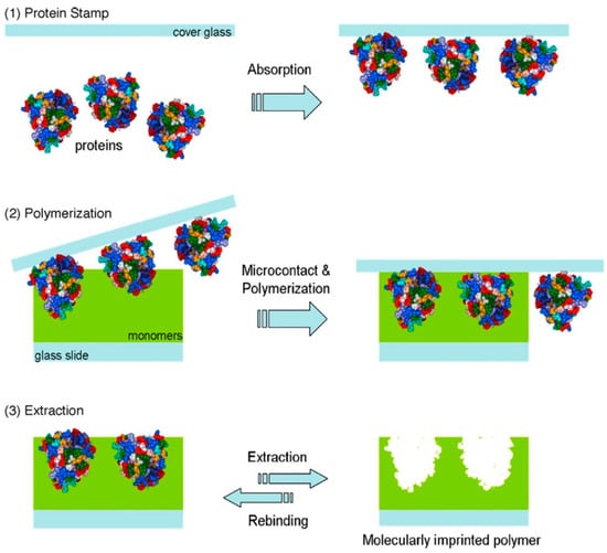 Micro-contact imprinting is considered as one of the promising techniques for protein imprinting [61] that can address its common associated problems such as solubility, conformational stability, and aggregation during the polymerization process [62]. This approach allows rapid fabrication of MIPs using small amounts of template, and monomer solution with a possibility to polymerize dozens of samples at the same time applying the same polymerization batch [62,63,64,65]. In a typical procedure, the template is firstly immobilized or adsorbed on a support (glass) to create the protein stamp. The stamp is subsequently set in contact with monomers followed by a polymerization step. The cover glass is then removed yielding an imprinted thin film (Figure 4).