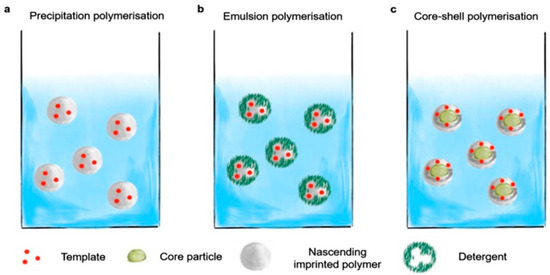 Several protocols used in preparation of nanoMIPs: (a) precipitation, (b) emulsion, (c) core–shell [2,92].