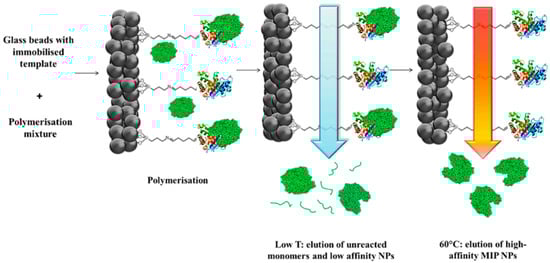 This technique is considered as one of the most advanced approaches for the fabrication of nanoMIPs. According to Canfarotta et al. [84], the solid phase method consists of three main steps: preparation of the glass beads by activation and silanization, immobilization of the template on the silanized glass beads, and finally the polymerization and purification process (Figure 7).