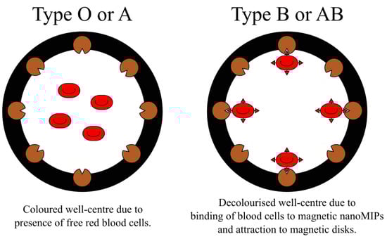 Another important aspect in the development of abiotic assays featuring MIP nanoparticles was the introduction of magnetic inserts in the wells of the microtiter plate [149]. The innovation involved the use of disk-shaped inserts made of magnetic material, which quickly and effectively captured any paramagnetic nanoparticles with immobilized target analytes. The internal opening of the disks allowed measurements of the reactions using standard microtiter plate readers. One of the examples of such application demonstrated that magnetic nanoMIPs imprinted with blood type B trisaccharide (Gal-⍺-1,3(Fuc-⍺-1,2)Gal) could be used in blood typing assays instead of natural antibodies [150]. The new format of the test system was based on magnetically-induced decolorization, caused by removal of erythrocytes from the solution by magnetic nanoMIPs (Figure 8).