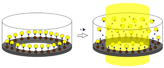 A schematic representation of the MINA process: the microtiter plate well is coated with fluorescent nanoMIPs (yellow) linked to biotin (blue). The biotin is fixed on magnetic nanoparticles (brown). By addition of free target species to the tested well, a displacement of the nanoMIPs occurs with subsequent diffusion to the center enhancing the fluorescent signal. Reproduced from [152] with permission.