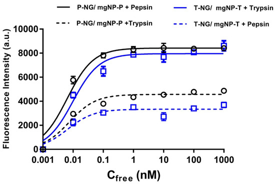Recently, an integrating approach for the synthesis and direct assay for protein-imprinted nanoMIPs has been reported using magnetic nanoparticles [153]. The enzymes trypsin and pepsin were immobilized on solid support, i.e., functionalized magnetic nanoparticles (magNPs). Subsequently, lightly crosslinked fluorescently doped polyacrylamide nanoMIPs were produced in the presence of the magNPs. The nanoMIPs were then used in a magnetic competitive fluorescence assay employing identical protein-conjugated magNPs as ligands to reversibly immobilize the corresponding nanoMIPs. Both nanoMIPs exhibited Kd < 10 pM for their respective target protein and low cross-reactivity was observed for reference proteins (Figure 10).