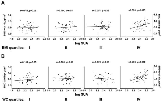 The strong influence of overall and central adiposity we observed was even more evident when the association between SUA and total hip BMD was explored within quartiles of BMI and WC. As displayed in Figure 1 and Supplemental Table S2, SUA and total hip BMD were significantly correlated only within the highest quartile of both anthropometric measures (panel (A), BMI quartile IV: r = 0.347, p = 0.02; panel B, WC quartile IV: r = 0.444, p = 0.001).