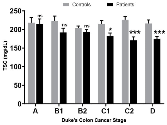 Total serum cholesterol levels observed by Miller et al. in colon cancer patients vs. controls. Error bars denote Standard Deviation. p values for paired t-test * = < 0.05, *** = < 0.001. ns = not significant.