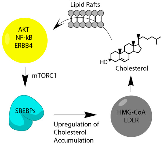 Cholesterol homeostasis in cells is regulated by SREBP1 and SREBP2 proteins belong to the Sterol Regulatory Binding Protein family (SREBPs), which are transcription factors that respond to intracellular levels of cholesterol [120]. SREBP1 was shown to regulate levels of LDLR in cells as do other proteins of the SREBP family who perform similar functions [121]. Subsequent observation by Porstmann et al. found that that SREBPs are regulated by the Molecular Target of Rapamycin Complex 1 (mTORC1) as a result of AKT oncogenic signaling [122]. This finding suggests that mTORC1 serves as a central regulator of cancer cell metabolism including cholesterol import and biosynthesis. mTOR signaling is overactive in many cancers, including breast, prostate, lung, liver, and kidney cancers. As such, this mechanism of upregulating cholesterol biosynthesis is likely prevalent in these cancers [123]. Later studies also report this, Yue et al. reported that PTEN loss results in unabated PI3K/AKT signaling that induces the accumulation of cholesterol [124]. Yue et al. further reported that patient samples showing high cholesterol accumulation displayed a more aggressive phenotype. In another context, neuregulin activated ERBB4 (HER4) was shown to induce activity of SREBP-2 which resulted in higher low-density lipoprotein uptake [125]. Given that ERBB4 is one of many upstream regulators of AKT signaling, the cholesterol enriching tumor phenotype should be common in many ERBB4 expressing cancers [126]. In many cancers AKT seems to serve as a master regulator of cellular metabolism; including both of catabolic (cellular energetics) and anabolic processes, such as cholesterol biosynthesis (Figure 7). Interestingly, AKT signaling can be abated by using simvastatin which would suggest that cholesterol pays a role in allowing AKT signaling to proceed [99]. This could be explained simply by the fact that cholesterol forms a large component of lipid rafts and that AKT signaling is localized to lipid rafts [127]. While this may be the simple explanation, the relationship between cholesterol and AKT signaling is probably more complex, owing to the findings that cholesterol serves as a signaling molecule.