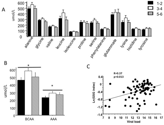 | Amino Acids mmol/L | Non Responders | Responders | NR vs R (p Value) | Viral Load (R) |