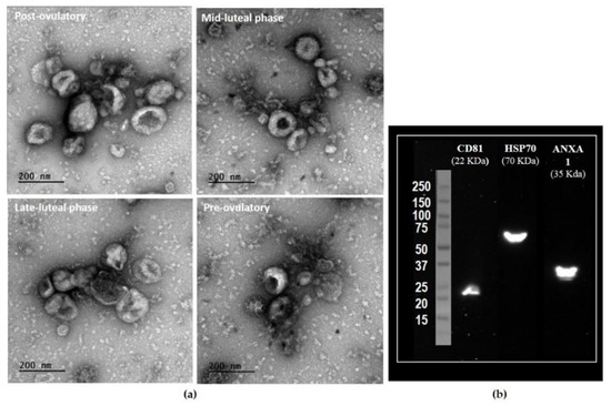 Transmission electron microscopy (TEM) observation confirmed the presence of oEVs at the four stages of cycle analyzed (Figure 1). Oviductal EVs samples contained a majority of vesicles resembling exosomes (size of 30–100 nm; 76.4 ± 0.8%) and a small population of vesicles resembling microvesicles (>100 up to 500 nm: 23.7 ± 0.8%), with similar proportions among stages, as we previously showed in cattle [9]. Western blotting confirmed the expression of exosomal cytosolic markers (CD81, HSP70, and ANXA1) in the oEV samples (Figure 1).