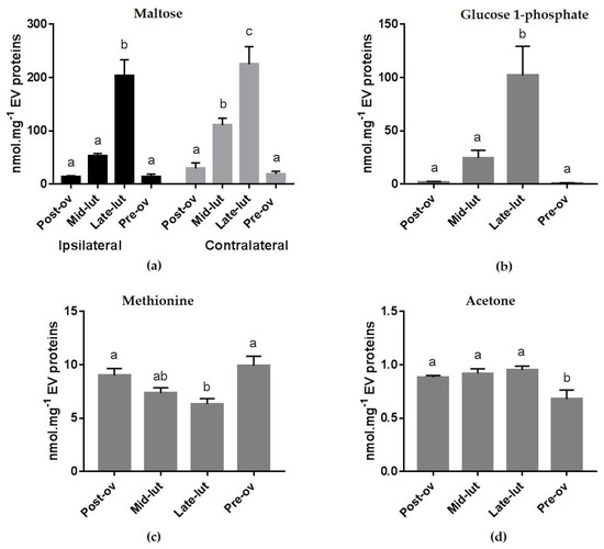 Differential concentrations of specific bovine oEV metabolites across the estrus cycle. Maltose intra-oEV concentrations (nmol.mg−1 of EV protein, (a) was affected by the cycle stage and side of ovulation. Glucose-1-P (b), methionine (c) and acetone (d) intra-oEV concentrations were only influenced by the stage of the estrus cycle. For (b–d), ipsilateral and contralateral concentrations data were pooled as the side of ovulation did not show any significant effect on the metabolite level. (Post-ov: post-ovulatory phase; Mid-lut: mid-luteal phase; Late-lut: late lutal phase; Pre-ov: pre-ovulatory phase).