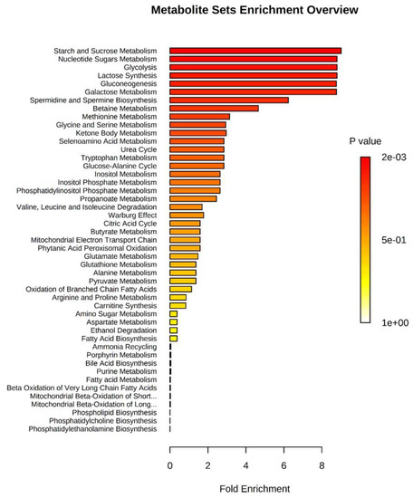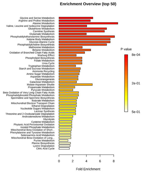Graphical overview of the quantitative enrichment analysis for all metabolites quantified in bovine oEVs generated by MetaboAnalyst 4.0 web-based software. Pathway associated metabolite sets are sorted based on fold enrichment and p-value after comparison between stages. This bar chart was obtained by comparing Pre-ov vs. Late-lut stages. For each stage, ipsilateral and contralateral data were pooled. Further details on p-values and metabolites included in each pathway are detailed in Table 5.