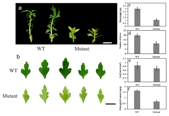 Morphological indexes were first selected to characterize mutant lines and WT plants appropriately. Three individual 40-day-old plants of mutant lines (Line 4, 14, and 18) and WT plants were randomly selected for further analysis. We measured their height, leaf number, and average leaf area of the leaf line-ups (5 leaves, the 1st to the 5th leaf from the apex) to examine morphological differences among the genotypes. Plant height and leaf area were measured using ImageJ software. All the plants were maintained in the growth chamber (16 h day/8 h night, 130 μmol m−2s−1 light intensity, 60% relative humidity). Three replicates were included in each experiment. Significant differences (p < 0.05) among values were assessed by t-test.