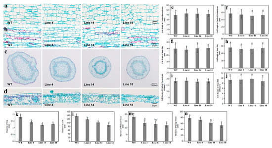 To observe the microstructure differences among the mutant and WT plants, leaf and stem sections of mutant and WT plants were examined and compared under a light microscope. Longitudinal stem sections revealed no significant difference in the size of cortical or stem pith parenchyma cells (Figure 4e–h) between mutant lines and WT plants (Figure 4a,b). However, the stem diameters of mutant lines were significantly thinner than those of WT plants (1.39 mm for Line 4, 1.19 mm for Line 14, 1.26 mm for Line 18, and 1.79 mm for WT) (Figure 4k). Parenchyma cell densities in the cortex and pith were further calculated, but no significant differences were found among the two genotypes (Figure 4i,j). Thus, these results suggested that the decrease in stem diameter was associated with the decline in cell numbers. In addition, we found that the leaves of mutant lines were significantly thinner than those from the WT plants (117.89 μm for Line 4, 101.54 μm for Line 14, 87.33 μm for Line 18, and 135.8 μm for WT) (Figure 4d,l). Moreover, the mutant lines possessed markedly thinner palisade and spongy tissues than the WT plants. (Figure 4m,n).
