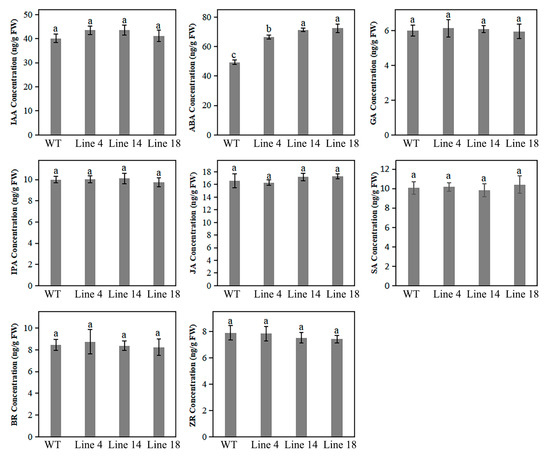 The concentration of ABA was significantly higher in the mutant lines, whereas the levels of other plant hormones including, IAA, GA, IPA (indolepropionic acid), JA (jasmonate), SA, BR, and ZR (zeatin riboside) only slightly differed between mutant lines and WT (Figure 5). Concentrations of ABA ranged from 66 ng/g FW to 72 ng/g FW in the mutant lines versus 49 ng/g FW in the WT.