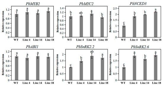 Furthermore, genes involved in ABA pathways were selected, including MYB2, MYC2, ABI1, SnRK2, and NCED3. We then monitored the expression levels of their corresponding homologous genes in the mutant lines and WT using qRT-PCR. Transcript levels of PbNCED3, PbSnRK2.2, and PbSnRK2.6 were significantly higher in the mutant lines than in the WT, whereas the transcript level of PbMYC2 was only slightly higher in the mutant lines. Alternatively, the transcript levels of PbABI1, PbMYB2, and PbMYC2 did not significantly differ among the mutant lines and WT (Figure 6).