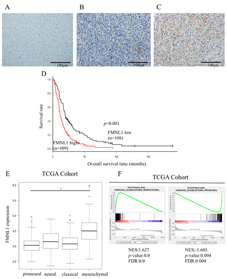 FMNL1 expression is associated with poor glioblastoma multiforme (GBM) prognosis. (A–C) FMNL1 was not detected by immunohistochemistry in (A) normal tissues but maybe (B) modestly or (C) strongly expressed in GBM tissues. Original magnification 200×. (D) Overall survival is significantly lower in patients with high FMNL1 expression than in those with modest FMNL1 expression (p = 1.34 × 10−5). Survival rates were calculated using the Kaplan–Meier method and compared using the log-rank test. (E) FMNL1 expression levels in the mesenchymal GBM subtype were higher than in the proneural GBM subtype per the ANOVA with the Holm test, with bars indicating SD. * p < 0.01. (F) Gene set enrichment plots for VERHAAK_GLIOBLASTOM A_MESENCHYMAL and VERHAAK_GLIOBLASTOMA_PRONEURAL in GBM specimens from TCGA.