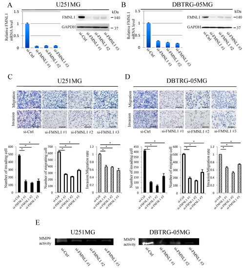 FMNL1 knockdown suppresses GBM migration and invasion. (A,B) Reverse transcription (RT)-PCR and Western blot of FMNL1 in (A) U251MG and (B) DBTRG-05MG cells transfected with control or FMNL1 siRNAs. GAPDH was used as a loading control in the Western blot assays. (C,D) FMNL1 knockdown suppressed migration and invasion of (C) U251MG and (D) DBTRG-05MG cells. Representative images of transwell migration and invasion of FMNL1 knockdown cells at 200× magnification that were quantified. Scale bar: 100 μm. Columns represent migrating or invading cells from five independent microscopic fields, with bars indicating SD. * p < 0.01 vs. cells transfected with control siRNA. FMNL1 knockdown suppressed MMP9 activity; (E) MMP9 activity in the cell-conditioned medium was evaluated using gelatin zymography.