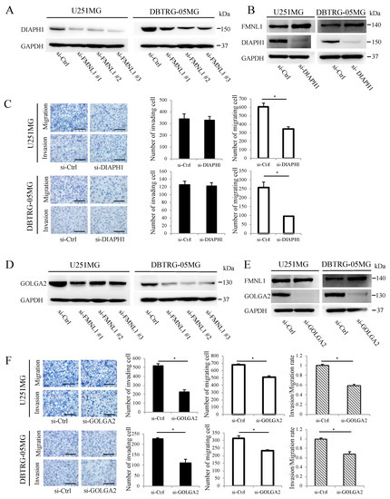 FMNL1-mediated GBM migration and invasion depend on DIAPH1 and GOLGA2, respectively. (A,B) DIAPH1 and FMNL1 protein expression in the cells transfected with siRNA against (A) FMNL1 and (B) DIAPH1. (C) Representative images and quantification of migration and invasion of DIAPH1 knockdown cells. Original magnification 200×; scale bar: 100 μm. (D,E) Protein expression of GOLGA2 and FMNL1 in the cells transfected with siRNAs against (D) FMNL1 and (E) GOLGA2, with GAPDH as a loading control. (F) Migration and invasion of GOLGA2 knockdown cells, which were quantified. Original magnification 200×; scale bar: 100 μm. Columns represent migrating or invading cells from five independent microscopic fields, with bars indicating SD. * p < 0.01 vs. cells transfected with control siRNA.