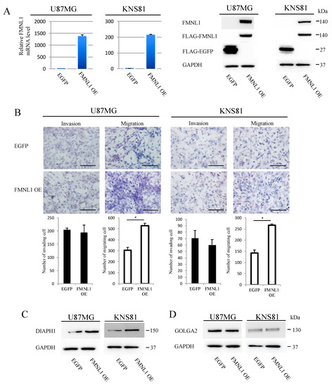 FMNL1 overexpression induces migration but not invasion. (A) Reverse transcription (RT)-PCR (left) and Western blot (right) of FMNL1 in U87MG and KNS81 cells infected with FMNL1 or EGFP lentiviral expression vectors. (B) Representative images of transwell migration and invasion of cells overexpressing FMNL1 and EGFP shown at 200× magnification, which were quantified. Scale bar: 100 μm. Columns represent migrating or invading cells from five independent microscopic fields, with bars indicating SD. * p < 0.01 vs. cells overexpressing EGFP. (C,D) Protein expression of DIAPH1 and GOLGA2 in (C) U87MG and (D) KNS81 cells transfected with FMNL1 or EGFP lentiviral expression vectors.