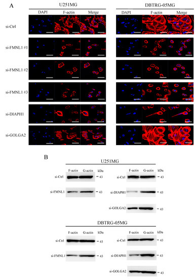 In GBM cells transfected with siRNA against FMNL1, structured actin fibers were lost, morphological changes were observed, and filamentous actin significantly diminished (Figure 5A,B), highlighting FMNL1 as a regulator of actin assembly. Similar results were obtained in cells transfected with siRNA targeting DIAPH1 but not in cells transfected with siRNA against GOLGA2 (Figure 5A,B). These findings suggested that FMNL1 regulates the actin cytoskeleton in GBM cells via DIAPH1 but not GOLGA2.