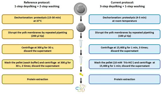 Schematic representation of major differences between the reference [16] and the current deyolking protocols. The detailed information is given in the text.