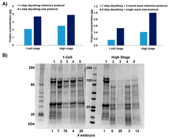 Both methods resulted in a reduction of yolk proteins, and the washing steps further depleted the protein content. Nevertheless, our new protocol yielded a larger number of unique proteins from a smaller number of embryos. We obtained approximately 1.7-fold increase in protein concentration per embryo sample when applying the 1-step deyolking process. When using our 3-step deyolking + single wash protocol, the protein yields per embryo sample were 3.1- and 2.5-fold higher (1-cell and high stage embryos, respectively) than those obtained with the reference protocols [16] with 1-step deyolking + double wash (Figure 2A). The effective number of 1-cell stage embryos needed to collect a workable amount of protein (30 µg) was approximately 2 or 3 times lower when using our 1-step deyolking or 3-step deyolking + single wash protocols, respectively; for the high stage embryos, this number of embryos was approximately 2 times lower than that of the respective reference protocols (Figure 2B). Also, compared to our new protocol, less amount of proteins was harvested with the reference protocol (Figure 2B).