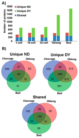 Numbers of proteins identified in samples from intact (non-deyolked, ND) versus deyolked (DY) zebrafish embryos. Unique proteins were found in either ND or DY embryos, whereas shared proteins were found in both ND and DY embryos. (A) Total number of unique and shared proteins in ND (left column) and DE embryos (right column) at 1-cell, 16-cell, 32-cell, oblong, and bud developmental stages. (B) Specificity and overlap of the identified proteins across the critical stages of early embryonic development: Cleavage stages (1-, 16-, and 32-cell stages combined), maternal–zygotic transition (oblong), and post-maternal–zygotic transition (bud).