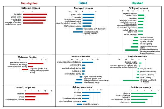Analysis of representation of the identified proteins annotated to functional Gene Ontology (GO) terms revealed multiple processes, functions, and components overrepresented and underrepresented in both non-deyolked and deyolked samples, with some of them specific to the developmental stage (Figure 4, Supplementary File 4).