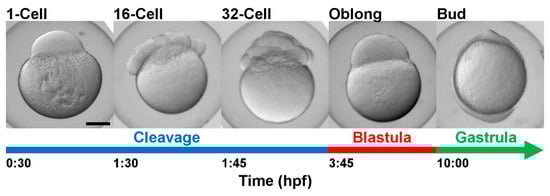 - White, R.J.; Collins, J.E.; Sealy, I.M.; Wali, N.; Dooley, C.M.; Digby, Z.; Stemple, D.L.; Murphy, D.N.; Billis, K.; Hourlier, T. A high-resolution mRNA expression time course of embryonic development in zebrafish. Elife 2017. [Google Scholar] [CrossRef] [PubMed]