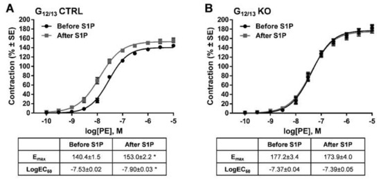 Identification of the G-protein involved in the signal transduction pathway mediating the potentiating effect of S1P. In G12/13 control (G12/13 CTRL vessels), the potentiating effect of S1P was clearly detectable (A), whereas the lack of G12/13 proteins (G12/13 KO) completely abolished it (B). * p < 0.05 vs. before S1P (n = 13–22).