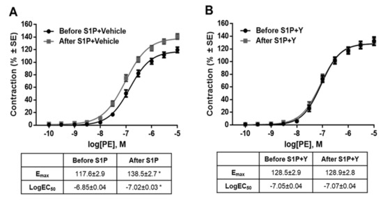 Sphingosine-1-phosphate, U46619, and Y-27632 were purchased from Cayman Chemical Company (Ann Arbor, MI, USA). Fasudil hydrochloride, albumin, and all other drugs and chemicals used in the present study were purchased from Sigma-Aldrich (St. Louis, MO, USA). Stock solutions were made by dissolving the chemicals in 0.3 N sodium hydroxide (S1P), in 5% charcoal treated albumin (S1P), DMSO (U46619), distilled water (Y-27632, fasudil), or isotonic salt solution (PE, ACh).