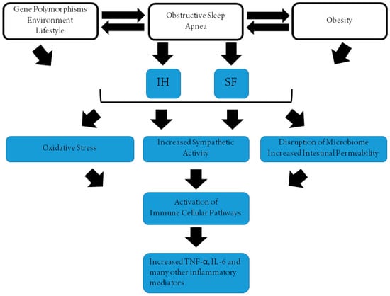 In addition to OSAS or its intrinsic components fostering a pro-inflammatory state and manifesting as increased circulating levels of TNF-α, it is also possible that the reciprocal relationships might favor the emergence of upper airway dysfunction or of other mechanisms that facilitate the onset of OSAS. For example, intermittent hypoxia can generate inflammatory processes in the carotid body, which then translate into altered immunoregulation as well as perturbations in control of breathing that may facilitate the propensity for respiratory instability during sleep [,,,,,,]. Furthermore, although specific studies are lacking in relation to upper airway musculature, increases in TNF-α in the context of other conditions (e.g., obesity) may promote muscle dysfunction and therefore enhance the likelihood of upper airway dysfunction [,,].