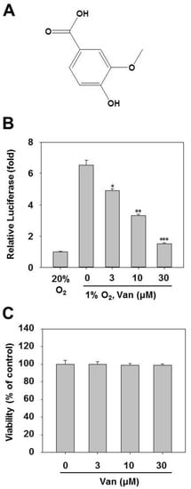 Identification of vanillic acid (Van) as a HIF-1 pathway inhibitor from a cell-based screening assay. (A) Chemical structure of vanillic acid (Van). (B) HCT116 cells were transiently co-transfected with a pGL3-HRE-Luciferase and pRL-CMV vectors. Following 24 h incubation, cells were treated with various concentrations of vanillic acid (Van) and then subjected to hypoxia, or remained in normoxia for 12 h. Data were shown as mean ± SD (n = 3). * p < 0.05, ** p < 0.01, *** p < 0.001, compared with hypoxia control. (C) Cells were incubated with different concentrations of vanillic acid (Van). After 24 h incubation, cell viability was determined by MTT assays.
