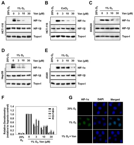 Vanillic acid (Van) inhibits HIF-1α protein expression in a dose-dependent manner. (A,C–E) HCT116, SW620 cells, Hep3B, and A549 cells were pretreated without or with indicated concentration of vanillic acid (Van), then cultured under normoxic or hypoxic conditions for 12 h. Whole-cell lysates for HIF-1β and nuclear extract for HIF-1α were detected by Western blot. Anti-Topo-I antibody was used as a loading control. (B) HCT116 cells were cultured with the indicated concentration of vanillic acid (Van) for 30 min and treated with CoCl2 (200 µM). After 12 h incubation, the whole-cell lysates for HIF-1β and nuclear extract for HIF-1α was detected by Western blot. Anti-Topo-I antibody was used as a loading control. (F) Data were shown as mean ± SD (n = 3). * p < 0.05, ** p < 0.01, *** p < 0.001, compared with hypoxia control. (G) HCT116 cells cultured in chamber slides, then were treated with or without vanillic acid (Van, 30 µM) under normoxic or hypoxic conditions for 12 h. The left column shows the HIF-1α protein in green fluorescence. The middle column shows nuclei stained with 4′,6-diamidino-2-phenylindole (DAPI, blue fluorescence). The right column shows the merged images. Magnification = 400×.