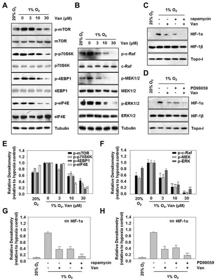 Vanillic acid (Van) decreased HIF-1α protein synthesis via mTOR/p70S6K/4E-BP1 and Raf/MEK/ERK pathways in HCT116 cells. (A) HCT116 cells were pretreated without or with indicated concentration of vanillic acid (Van), then cultured under normoxic or hypoxic conditions. After 12 h incubation, phospho-mTOR, phospho-p70S6K, phospho-4E-BP1, and phospho-eIF4E were detected by Western blot analysis. The bottom represents the corresponding total protein to show the equal loading of cell lysates. Levels of tubulin were used as a loading control. (E) Data are shown as mean ± SD (n = 3). * p < 0.05, ** p < 0.01, *** p < 0.001, compared with hypoxia control. (B) HCT116 cells were pretreated without or with indicated concentration of vanillic acid (Van), then cultured under normoxic or hypoxic conditions. After 12 h incubation, phospho-c-Raf, phospho-MEK1/2, and phospho-ERK1/2 were detected by Western blot analysis. The bottom represents the corresponding total protein to show the equal loading of cell lysates. Levels of tubulin were used as a loading control. (F) Data are shown as mean ± SD (n = 3). * p < 0.05, ** p < 0.01, *** p < 0.001, compared with hypoxia control. (C,D) HCT116 cells were pretreated without or with indicated concentration of vanillic acid (30 µM), rapamycin (100 nM), and PD98059 (50 µM), then cultured under normoxic or hypoxic conditions. After cells were harvested, the whole-cell lysates for HIF-1β and nuclear extract for HIF-1α was detected by Western blot. Anti-Topo-I antibody was used as a loading control. (G,H) Data were shown as mean ± SD (n = 3). ** p < 0.01, *** p < 0.001, compared with hypoxia control.