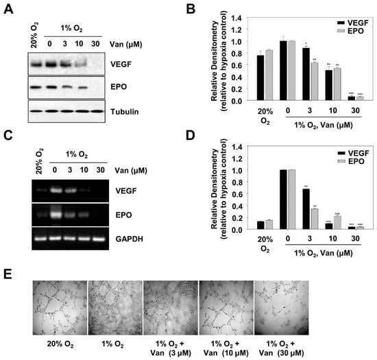 Vanillic acid (Van) inhibits tumor angiogenesis. (A) HCT116 cells were pretreated without or with indicated concentration of vanillic acid (Van), then cultured under normoxic or hypoxic conditions. After 12 h incubation, VEGF and EPO were detected by Western blot analysis. Levels of tubulin were used as a loading control. (B) Data were shown as mean ± SD (n = 3). * p < 0.05, ** p < 0.01, *** p < 0.001, compared with hypoxia control. (C) HCT116 cells were pretreated without or with indicated concentration of vanillic acid (Van), then cultured under normoxic or hypoxic conditions for 12 h. Total RNA was analyzed by RT-PCR as described in “Materials and Methods”. (D) Data are shown as mean ± SD (n = 3). ** p < 0.01, *** p < 0.001, compared with hypoxia control. (E) Human Umbilical Vein Endothelial Cells (HUVEC) were pretreated without or with indicated concentration of vanillic acid (Van), then cultured under normoxic or hypoxic conditions. The effect of vanillic acid (Van) on HUVEC cells tube formation was observed under a microscope. Magnification = 100×.