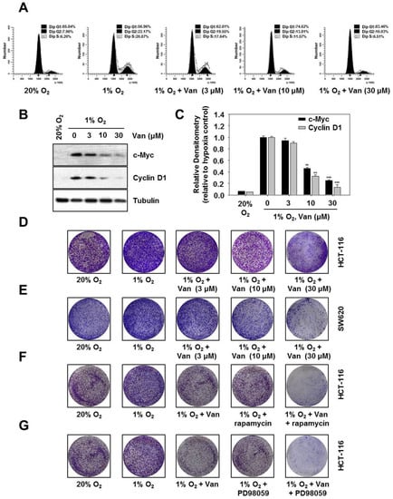 Hypoxia-inducible factor 1α (HIF-1α) mediates cell proliferation and survival []. Cell proliferation is primarily regulated by the cell cycle. To clarify the effect of vanillic acid on cell cycle progression in HCT116 cells, we performed flow cytometric assay to examine the DNA content of nuclei. As shown in Figure 6A, vanillic acid treatment with 30 µM markedly induced G1 phase arrest. Under hypoxia, cells in G1 phase increased from 56.96% in medium alone to 62.81, 74.62, and 83.46% in the presence of 3, 10, and 30 µM vanillic acid, respectively. These results suggested that vanillic acid suppressed cell proliferation and blocked cell cycle progression at G1 phase. Then, we elucidated the effect of vanillic acid on expression of G1 phase-regulatory proteins cyclin D1 and c-Myc. As shown in Figure 6B,C, vanillic acid dose-dependently reduced protein expression levels of cyclin D1 and c-Myc. Cell proliferation was also detected by a clonogenic assay. Following 12 h of treatment, vanillic acid (30 µM) decreased the number of hypoxia-exposed HCT116 cells and SW620 cells. In other words, the clonogenicity of HCT116 cells and SW620 cells were inhibited in a dose-dependent manner (Figure 6D,E). Furthermore, Figure 6F shows that vanillic acid or rapamycin suppressed clonogenicity of HCT116 cells, which was further inhibited by the combination of vanillic acid and rapamycin. Comparable results were obtained in Figure 6G, vanillic acid or PD98059 suppressed clonogenicity of HCT116 cells, which was further inhibited by the combination of vanillic acid and PD98059. Taken together, these results suggest that vanillic acid inhibits cell proliferation and prevents cell cycle progression at G1 phase.