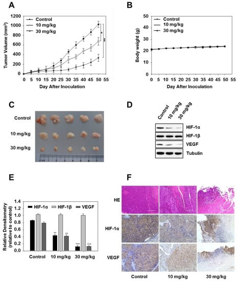 Based on our in vitro findings, HCT116 cells were injected subcutaneously in mice and induced tumor formation, administered p.o. three times a week with vanillic acid. As expected, we found that vanillic acid significantly inhibited tumor growth in vivo (Figure 7A). However, the body weight of the mice did not significantly decrease, indicating that the application of vanillic acid may display few cellular toxicity effects in vivo (Figure 7B). Tumors were harvested at 4 h after the last vanillic acid treatment, and representative tumor masses are shown in Figure 7C. Consistent with the findings in cultured cells, vanillic acid significantly reduced the HIF-1α and VEGF protein expressions in tumors tissue (Figure 7D,E). Furthermore, immunohistochemical analysis showed that vanillic acid inhibited HIF-1α and VEGF expressions compared with the control (Figure 7F).