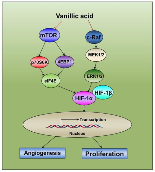 In summary, we found that vanillic acid inhibited HIF-1α by suppression of mTOR/p70S6K/4E-BP1 and Raf/MEK/ERK signaling pathways, subsequently inhibiting proliferation and angiogenesis of human cancer cells (Figure 8).