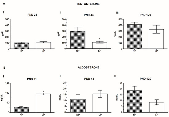 Serum hormones levels. (A) Plasma testosterone levels (ng/dL) at postnatal day (PND) 21 (I), PND 44 (II) and PND 120 (III), * p < 0.05 compared with the normoprotein (NP) group. (B) Plasma aldosterone levels (ng/dL) at PND 21 (I), PND 44 (II) and PND 120 (III), * p < 0.05 compared with the NP group. T-tests and the Mann-Whitney tests were used to assess the significance of the differences in parametric and nonparametric data, respectively.