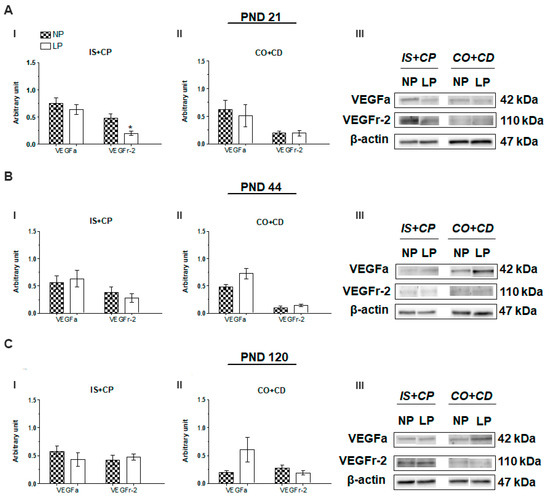 The VEGFa and VEGFr-2 immunoblots. (A) Levels of VEGFa and VEGFr-2 in the IS+CP (I) and corpus plus cauda (CO+CD) epididymis (II) of NP and low-protein (LP) animals on PND 21. Representative blots showing the levels of the VEGF, VEGFr-2 and β-actin proteins (70 µg of protein) in 21-day animals (III). (B) Levels of VEGFa and VEGFr-2 in the IS+CP (I) and CO+CD epididymis (II) of NP and LP animals on PND 44. Representative blots showing the levels of the VEGF, VEGFr-2, and β-actin proteins (70 µg of protein) in 44-day animals (III). (C) Levels of VEGFa and VEGFr-2 in the IS+CP (I) and CO+CD epididymis (II) of NP and LP animals on PND 120. Representative blots showing the levels of the VEGF, VEGFr-2 and β-actin proteins (70 µg of protein) in 120-day animals (III). Data are presented as means ± S.E.M. * p < 0.05, Mann-Whitney test.