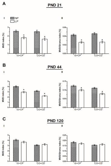 The microvascular densities. (A) microvasculature density (MVD) index (I) and MVD/Stroma index (II) in the IS+CP and CO+CD of 21-day-old animals. (B) MVD index (I) and MVD/Stroma index (II) in the IS+CP and CO+CD of 44-day-old animals. (C) MVD index (I) and MVD/Stroma index (II) in the IS+CP and CO+CD of 120-day-old animals. Data are presented as means ± S.E.M. * p < 0.05, Mann-Whitney test.